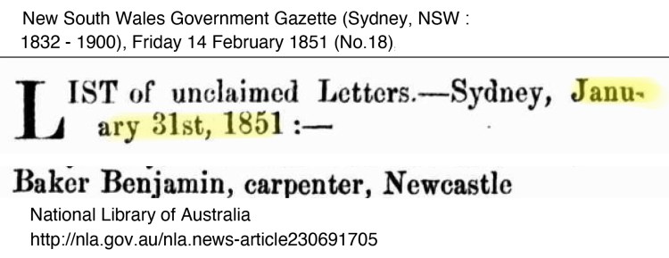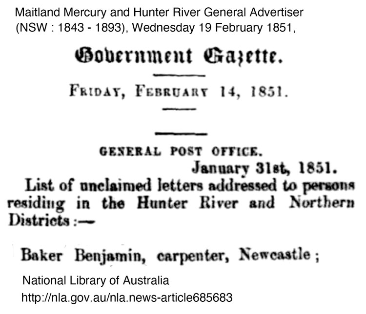 Benjamin and Elizabeth Baker’s daughter Mary Ann on 19 November 1848 is the first document that places his abode as New Freugh where his occupation stated is as a carpenter. The next reference is in the NSW Government Gazette advertised on 14 February 1851, it is for an unclaimed letter dated 31 January 1851 for ‘Benjamin Baker, Newcastle’.4