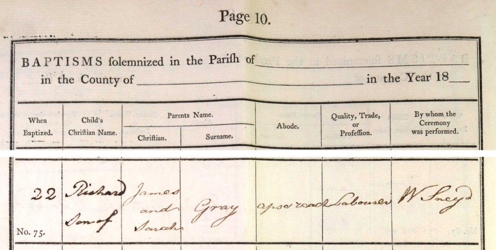 There appears to be an anomaly in the records for Peter and Ann’s next child. Whilst there is a baptismal record for ‘Richard’ Gray, there are no other records for him except this one. There are however, records for ‘Rachel’ Gray. I would propose that there is an error in the baptismal record of the name of the child being baptised and that it was in fact Rachel not Richard Gray. Rachel Gray has been recorded with the same birth/baptismal date. There is also no death record for a Richard Gray if they had been twins.