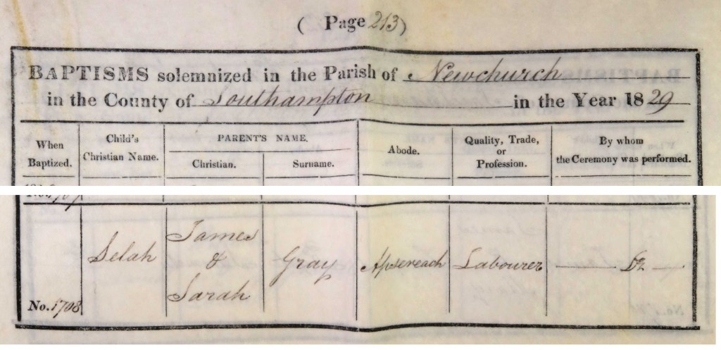 Selah Gray was baptised at Newchurch in 17 May 1829. She was the seventh child of James and Sarah Gray and was living at Apse Rd, Godshill.