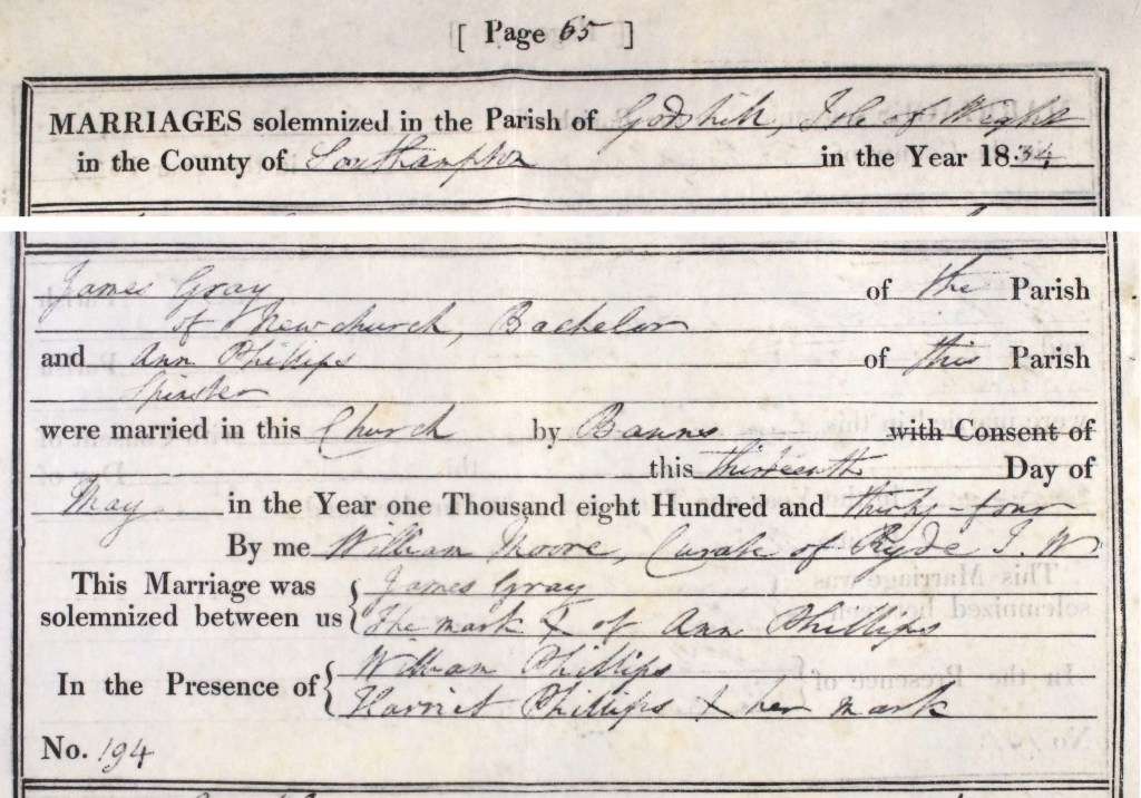 On 13 May 1834 at Godshill Church James Gray ‘Bachelor’ of Newchurch married Ann Phillips ‘of this Parish Spinster’. Like his father, James was able to write and sign his name, Ann signed with an ‘x’.