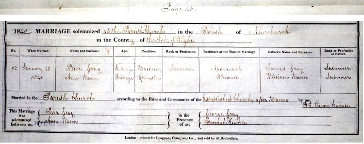 On 23 January 1840, at the same church in which he was baptised, Peter Gray married Ann Rann with both aged 20 years. By 1841 they are living at Haven St, Arreton with on year old George. Peter’s occupation as agricultural labourer.