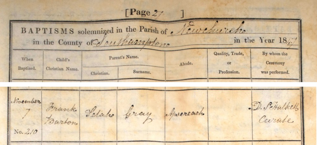 In 1847 when Sarah was 18 years old she gave birth to her first child, Frank Barton Gray. He was baptised on 7 November 1847 at Newchurch.