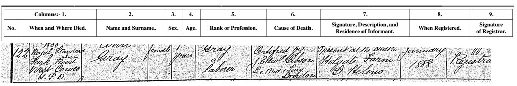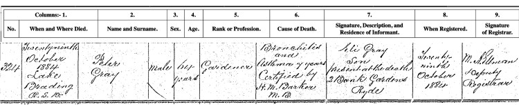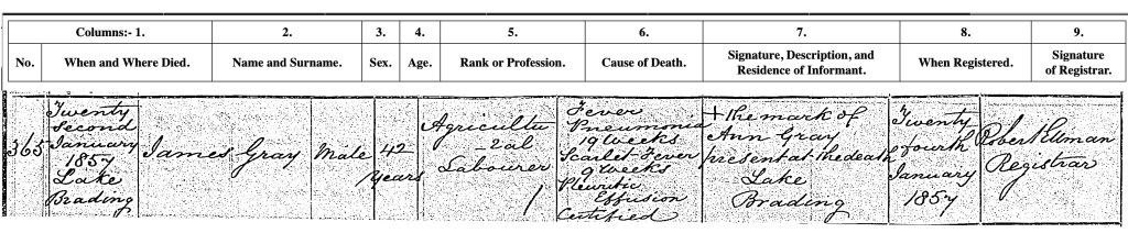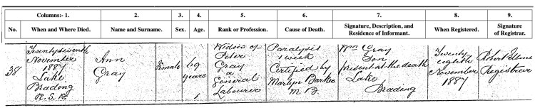 Three years later Ann Gray née Rann ‘Widow of Peter Gray’ also died at Lake Brading, she was aged 69 years. The cause was ‘Paralysis 1 week’. Peter and Ann’s son William Gray of Lake Brading was the informant for his mother’s death at which he was present.