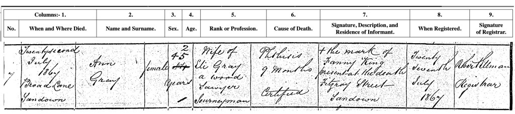 Just six years later Ann Gray née weeks dies. Ann was 45 years old and the wife of Eli a ‘wood sawyer’. The cause of death was ‘Phthisis’ which she had suffered with for nine months. The informant present at her death was Fanny King who lived at Fitzroy Street, Sandown.