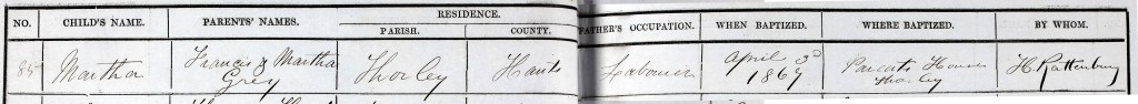 The family is still in Thorly on 3 April 1869 when their daughter Martha is baptised, this time in a ‘Private house, Thorly’.