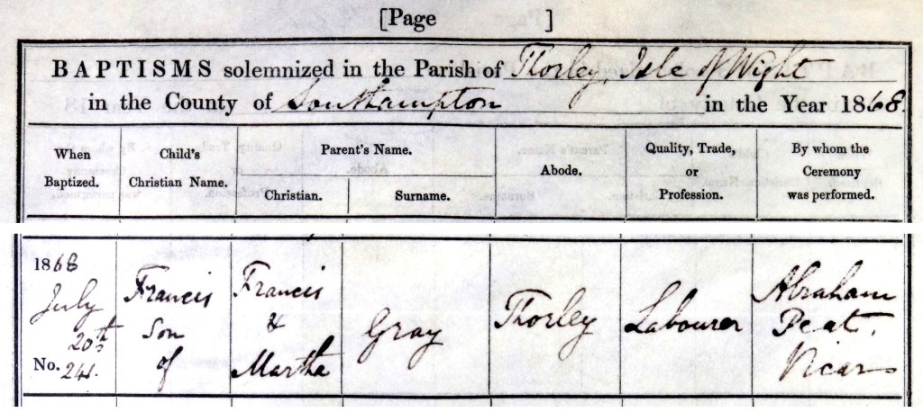 Francis and Martha’s youngest child was baptised on 29 July, 1868 at Thorly, named after his father Francis but in later records is known as Francis Burridge (Berridge) Gray, perhaps to distinguish him from his father but also carry down his mother’s maiden name.
