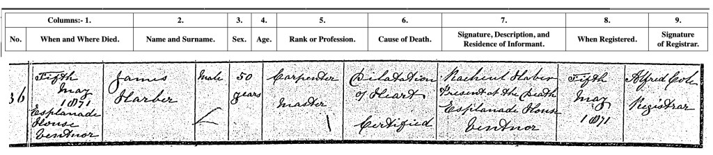 This same year on 5 May 1871, James Harber died at Esplanade House, Ventner, he was 50 years of age. The cause of death was ‘Dilation of Heart’ with his occupation being ‘Carpenter Master’. His wife Rachel was the informant and present at her husband’s death.