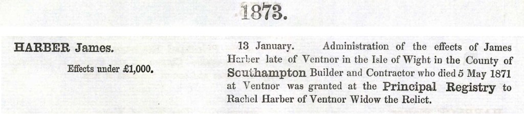 The Probate record for James Harber took nearly two years to be administered. His wife Rachel Harber was granted the administration. His occupation was noted as ‘Builder and Contractor’ with the estate being under £1000.