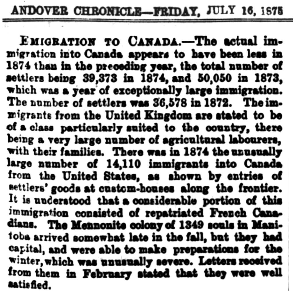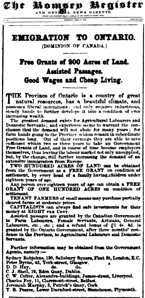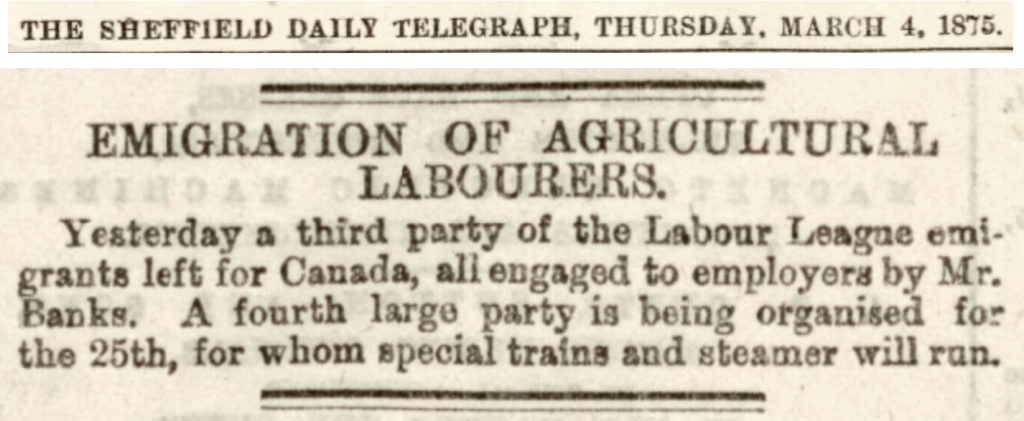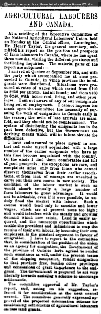 There are numerous references for the need for trades and labourers in Australia but as well as the need for this colony, Canada was also calling for agricultural labourers especially in the 1874 – 1875 time frame. The first newspaper article promotes good wages and cheap living to save for farming land as well the option of ‘free grants’. The second article refers to the meeting of the Executive Committee of the National Agricultural Labourers’ Union whose general secretary had visited Ontario, Canada to assess the situation for immigration their members.
