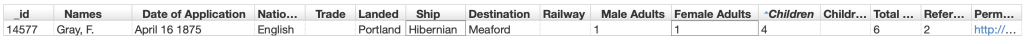 Although not conclusive, there is the one record that has been located that has the reference that could be relevant to the immigration of Francis and Martha Gray and their family. ‘F Gray, 1 adult male, 1 adult female, 4 children‘ on the ‘Hibernian’ steamship sailed from Liverpool England to Portland with the final destination being Meaford.