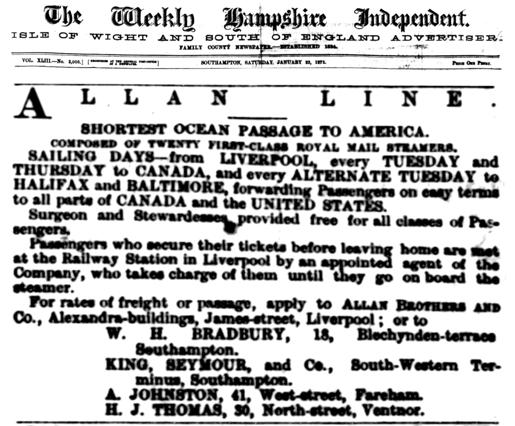 The ‘Hibernian’ was one of the voyages agricultural labourers were recruited to join, even holding local hall information sessions on the Isle of Wight. One newspaper report referenced 600 labourers on this voyage..