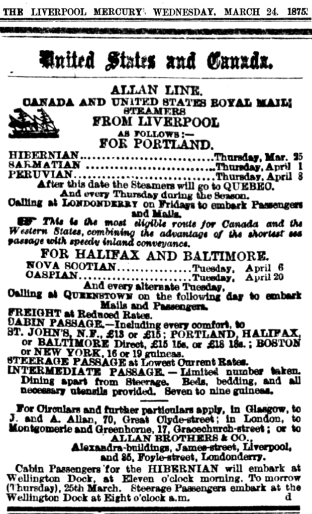 The ‘Hibernian’ steamship was part of the Allan Line of ships built in1862. The Allen Line boasted the fastest passage from Liverpool, England to Portland, Ontario. The voyage F Gray and his family were on left Liverpool, England on 25 March 1875.
