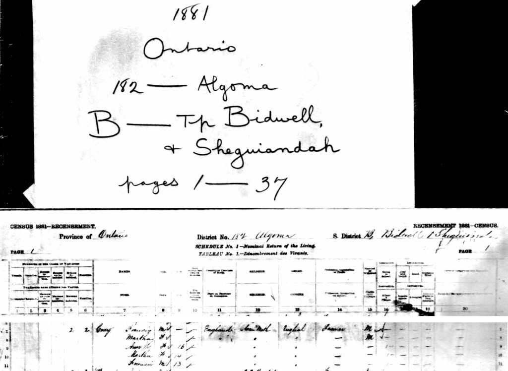The 1881 census for the Bidwell & Sheguiandah districts of the district of Algoma, Ontario, Canada, lists the family : Gray Francis ‘Farmer’ ; Martha ‘Wife’ and children Ann C, Martha and Francis. Although the immigration lists 4 children in 1875 this census does not record George Gray who by this time would have been 18 years of age.