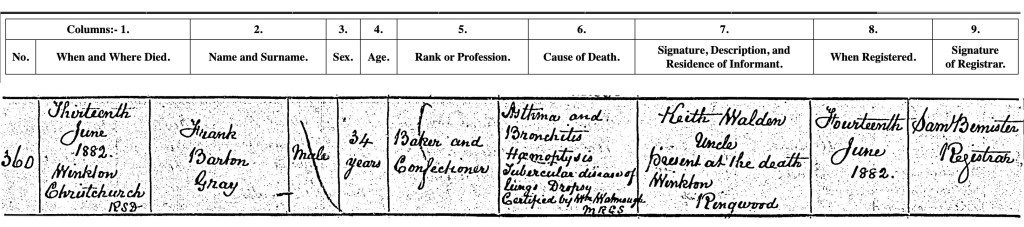 Just six months later tragedy struck on 13 June 1882 with Frank Barton Gray ‘Baker and Confectioner’ dying at Winslow, Christchurch. The cause of death was extensive: ‘Asthma and Bronchitis, Haemoptsis [coughing up blood], Tubercular disease of the lungs and Dropsy’. He was obviously extremely unwell and just 34 years of age. The informant was Keith Waldron obviously an Uncle of his wife Kate from Winklom, Ringwood and he was present at Frank Barton Gray’s death.