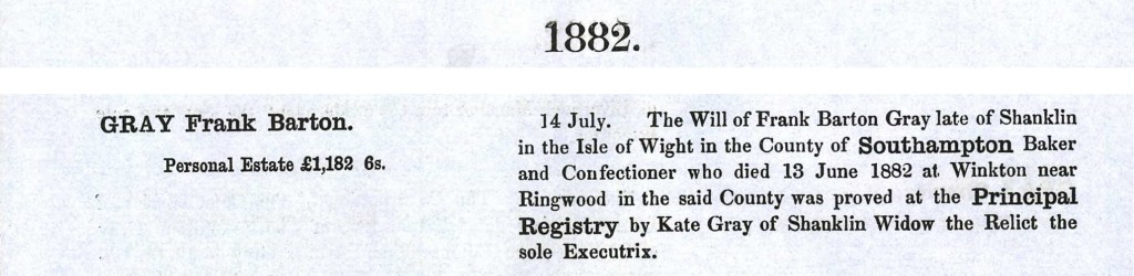 Sarah’s first son Frank Barton Gray in July 1872 married Kate Waldron a shop assistant in Ryde. Kate’s father Joseph Waldron was a grocer, and her brother Joseph a baker. As we saw from the 1871 census, at that time Frank was a pastry cook. The 1878 County Directory records Frank Barton Gray, baker and confectioner on High Street, Shanklin.