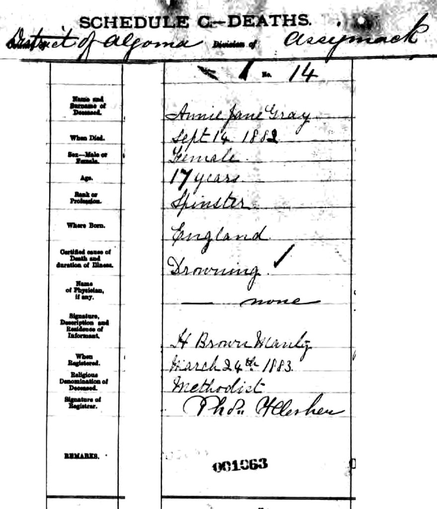 The next record is for the death of their second child, Ann Jane Coleman Gray ‘Annie Jane Gray’ at Assiginack on Manitoulin Island, on 14 September, 1882 at just 17 years of age. The cause of death was accidental drowning, the circumstances around the drowning is so far unknown.