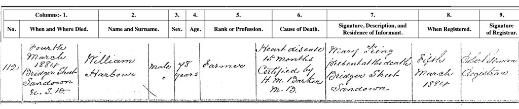 Three years later on 4 March 1884, William Harber ‘Farmer’ died at Bridger Street, Sandown with Mary King the informant present at his death. The cause of death was heart disease for the previous fifteen months.