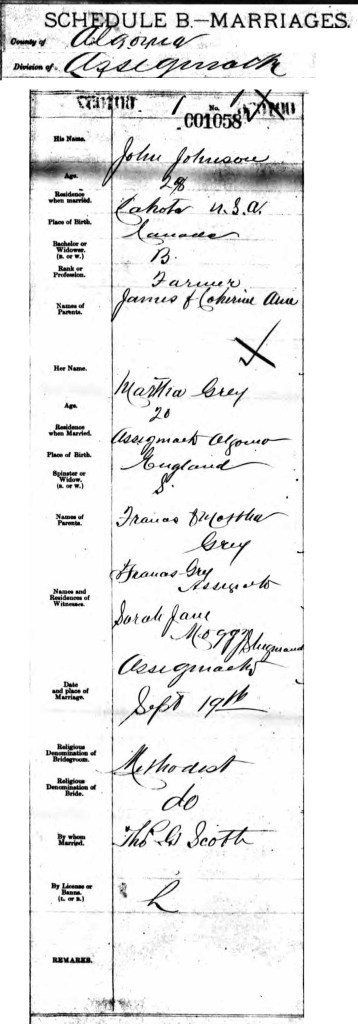 On 19 September 1887, Francis and Martha’s daughter Martha Grey (sic) married John Johnson a 28 years old and a farmer.