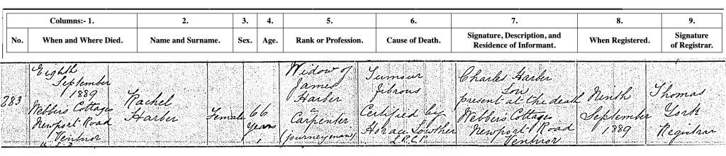 On 8 September 1889 Rachel Harber née Gray the ‘widow of James Harber’ aged 66 years died of ‘Tumour fibrous’ at Webbers Cottage, Newport Rd, Ventner. Her son Charles was present at her death and the informant.