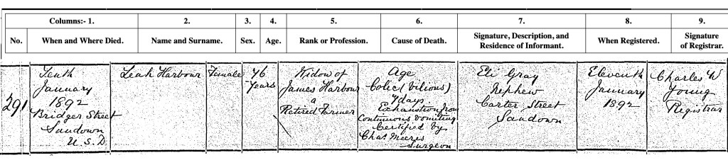 Leah Harber née Gray died on 10 January 1892 at the same address as her husband William, Bridger Street, Brading with her nephew Eli, likely Eli Frank Gray the son of her older brother James Ernest Gray who was living at Stagg St, not Carter St, Sandown. The cause of Leah’s death was recorded as ‘Colicil Vilius’ for 7 days and exhaustion from continuous vomiting.