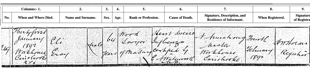 In 1871 44 year old Eli ‘Sawyer’ is living with his young 9 year old son Arthur at Lane, Brading. It has been difficult to find any records between 1871 and 1891 but by that final census record for Eli Gray, he was in Carisbrooke Workhouse a ‘widower’ working as a servant. The link to this being Eli Gray son of James and Sarah Gray is in his recorded occupation of ‘formerly sawyer’.