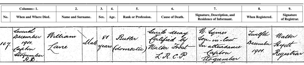 On 7 December 1901 William Lane aged 81 years died at Capton, Stogumber of ‘senile decay’ with his occupation recorded as ‘Butler (retired)’. The informant was W Symes, son-in-law of Capton, Stogumber. There is no mention of his wife Sarah on this record. He is buried at Nettlecombe, Somerset.