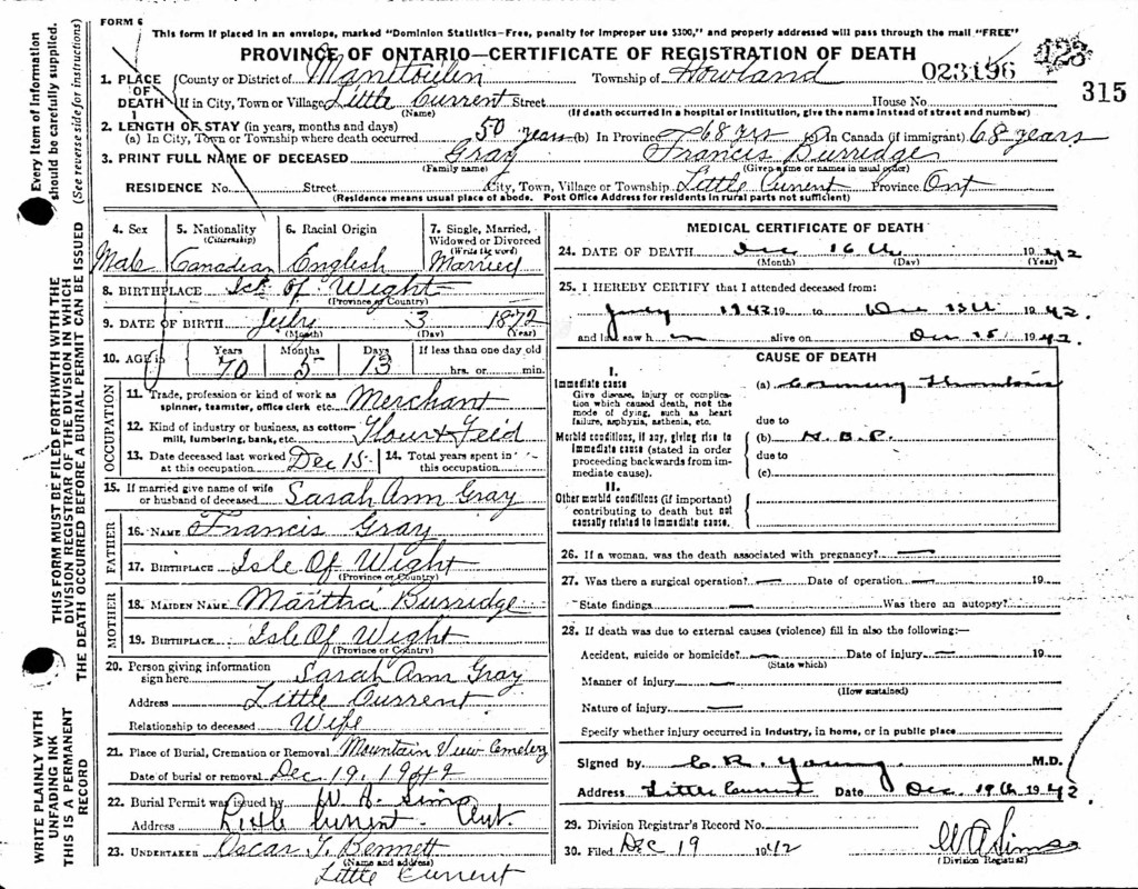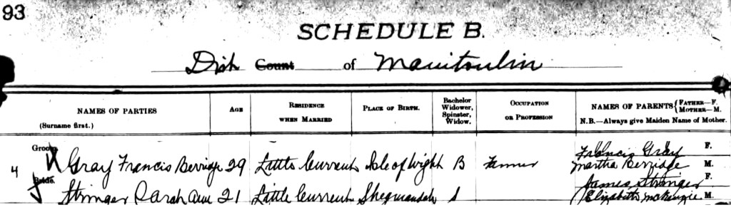 Further records show that Francis and Martha Gray and their children spent most of their lives on Manitoulin Island, Ontario, Canada.