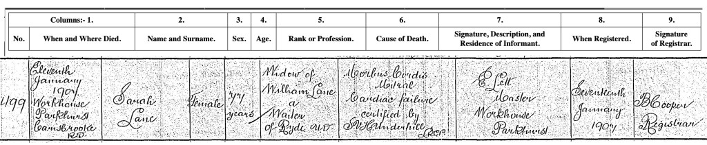 Sarah Lane née Gray died at the Carisbrooke workhouse on 11 January 1907 aged 77 years of ‘Morbis cordis … Cardiac Failure’. Her record stated she was the ‘Widow of William Lane a waiter Ryde’ with the informant being the master of the workhouse. It seems most likely that William and Sarah split up some time before 1881.
