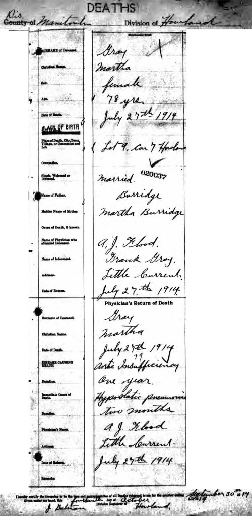 So now we come back to the final story of Francis and Martha Gray and their life in Canada. They remained living in Howland Township which was absorbed into the Little Current Township on Manitoulin Island, Ontario, Canada. The two excerpts from the records show the record of their deaths. Martha Gray née Burridge died on 27 July 1914 at Lot 9 , Con 7, Howland, aged 78 years. the cause of death was heart disease ‘Aortic insufficiency one year’ and ‘Hypostatic pneumonia two months’. The informant was her husband Francis who did not give her place of birth.