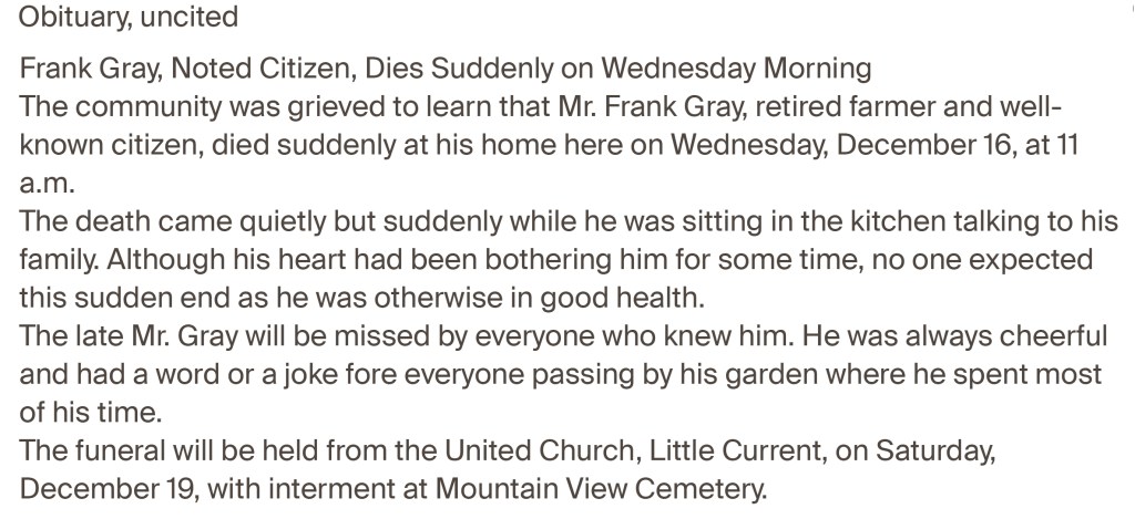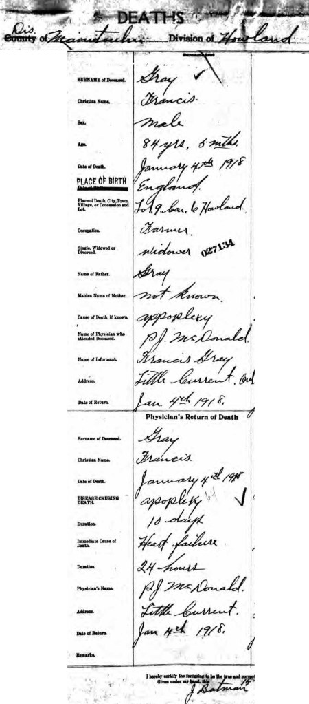 Francis Gray aged 84 years and 5 months died on 4 January 1918 at Lot 9, Con 6, Howland, the name of his informant was his son Francis (Frank) who sated his place of birth as simply England which it had been on all other documents. His occupation was listed as ‘Farmer’ and the cause of death was ‘apoplexy’, which means unconscious possibly from something like a stroke.