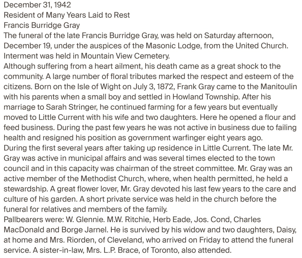 Francis and Sarah went on to have two children, their first daughter Bertha Inez Gray 28 August 1903 at Little Current, Manitoulin Island who married William Joseph Riordan in 1923, she died on 19 April 1976 at Rocky River, Cuyahoga, Ohio, USA. Their second daughter Daisy Frankie Gray was born 22 November 1911 in Howland Township Manitoulin Island. Daisy was still alive and living with her father Frank when he died on 16 December 1942 at Little Current, Manitoulin Island.