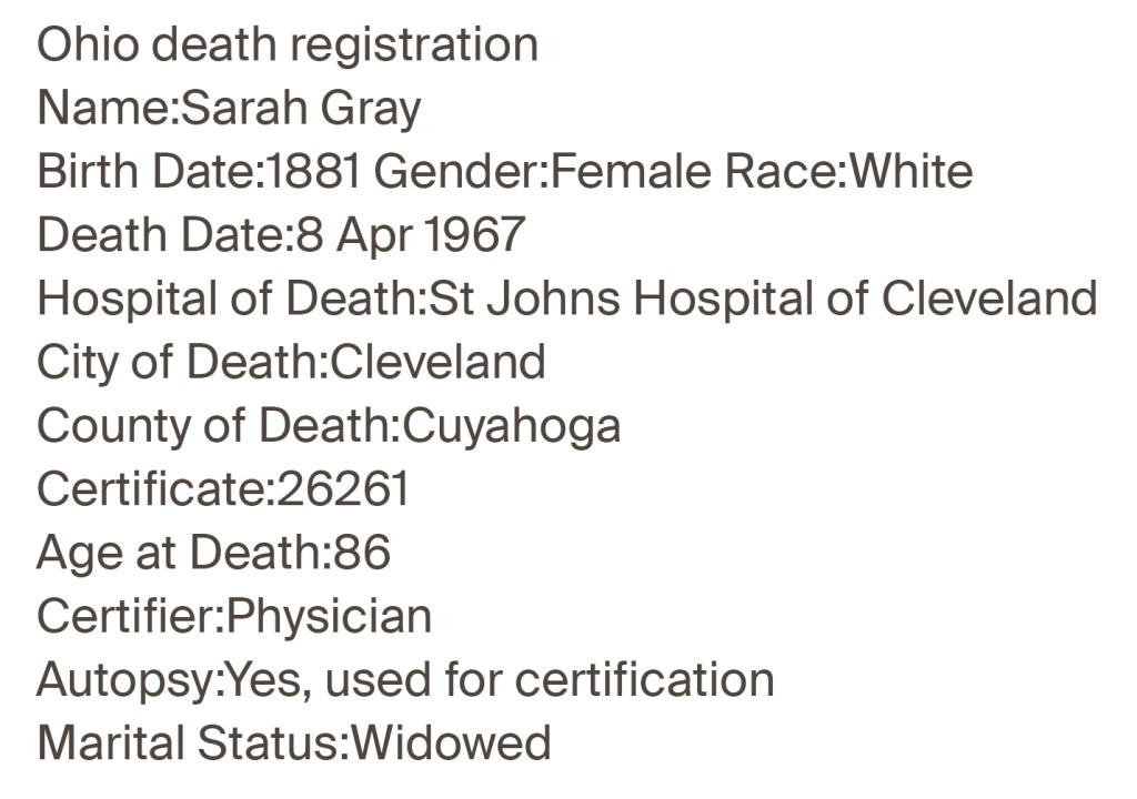 His wife Sarah Ann Gray nee Stringer died on 8 April 1967 at Cleveland, Ohio, USA. She was 86 years of age. Her obituary tells of the death of her daughter Daisy in 1964 but it has been difficult to find the details.