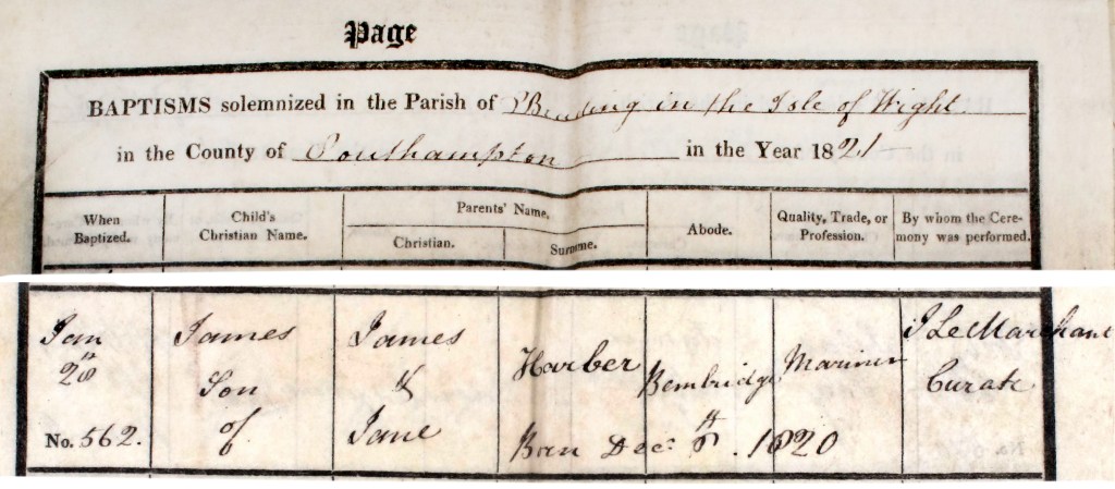 James Harber was baptised on 20 January 1821, at Brading. Unusually but also helpfully, this record also includes his birthdate: 8 Dec 1820.