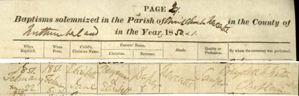 Of interest to the early settlement of ‘the folly’ again looking at births, baptism, marriage and death records are always worth looking at. A descendent of the family Sandra Boyd has been a great help in tracing a further connection between the Gray, Bull and Baker families. Ben and Elizabeth’s daughter Mary Ann Baker is recorded in the Parish of Whittingham Baptismal records on 19 November 1848, with their Abode recorded as ‘New Freugh’ where Ben is working as a ‘Carpenter’. This is a clear link between all three families with all living at New Freugh at that time.