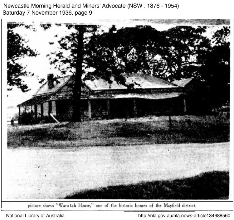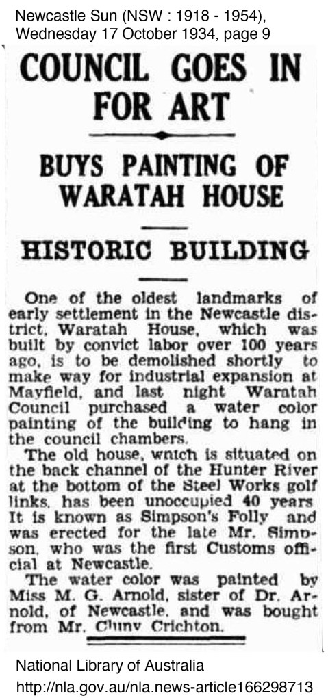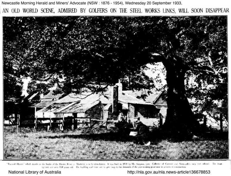 - Newcastle Morning Herald and Miners’ Advocate (NSW : 1876 – 1954), Wednesday 20 September 1933, page 5 “SIMPSON’S FOLLY” Historic Waratah House TO GIVE WAY TO INDUSTRY