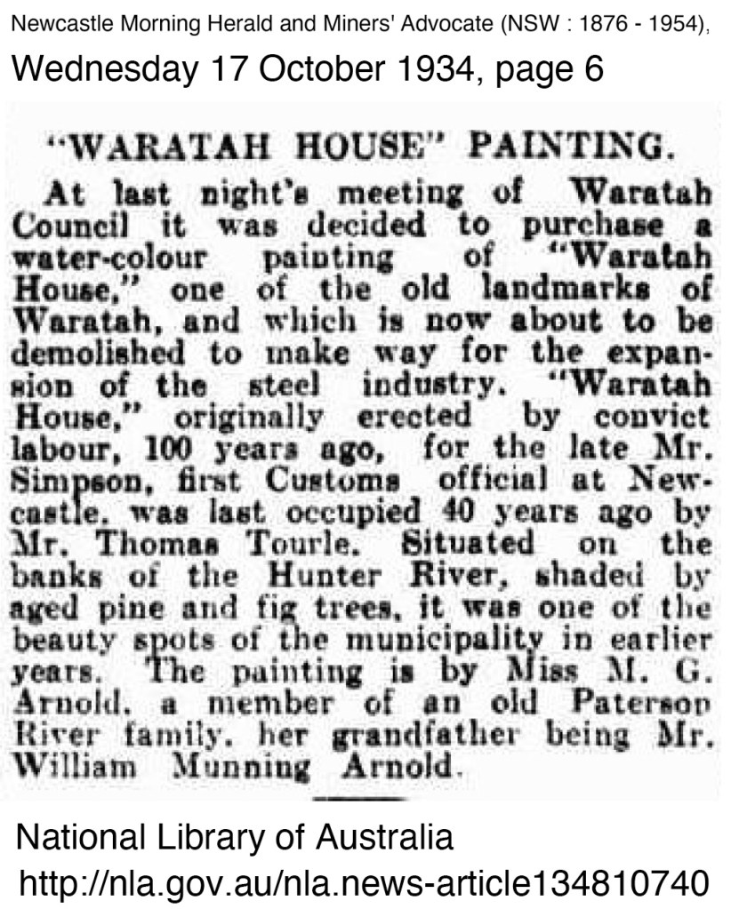- Newcastle Morning Herald and Miners’ Advocate (NSW : 1876 – 1954), Wednesday 17 October 1934, page 6 “WARATAH HOUSE” PAINTING