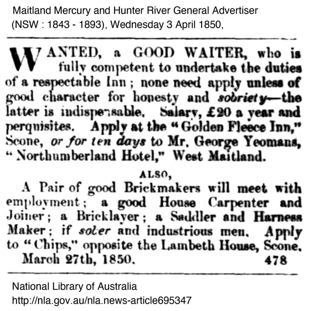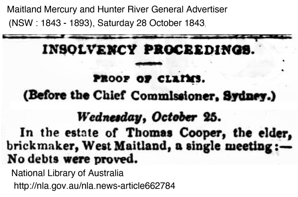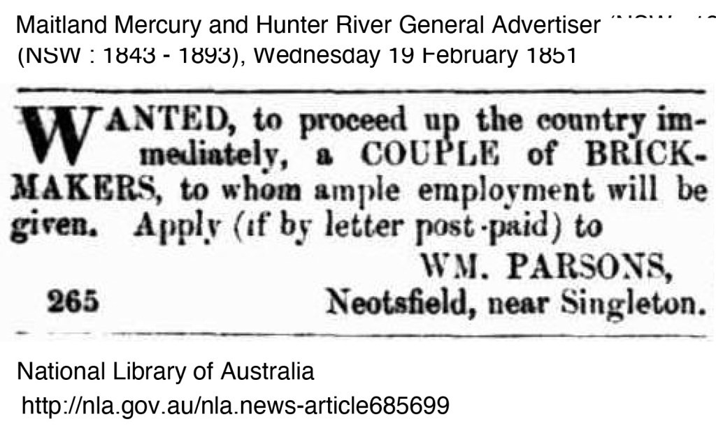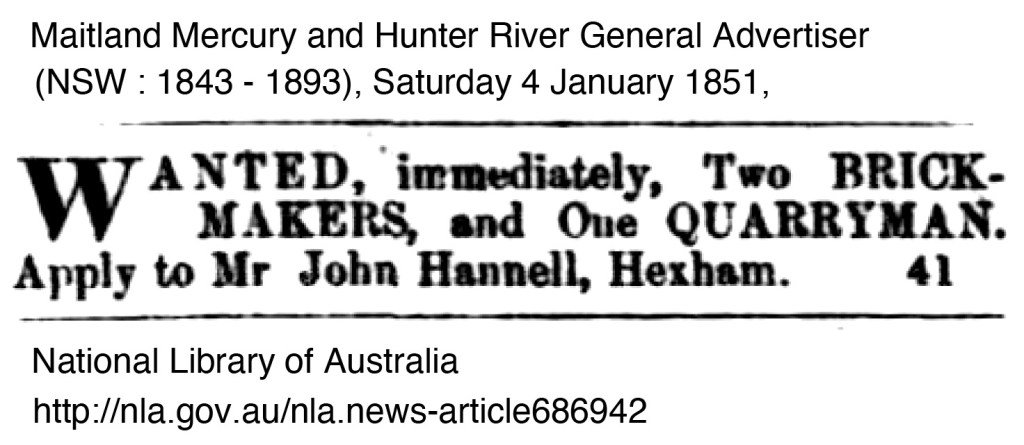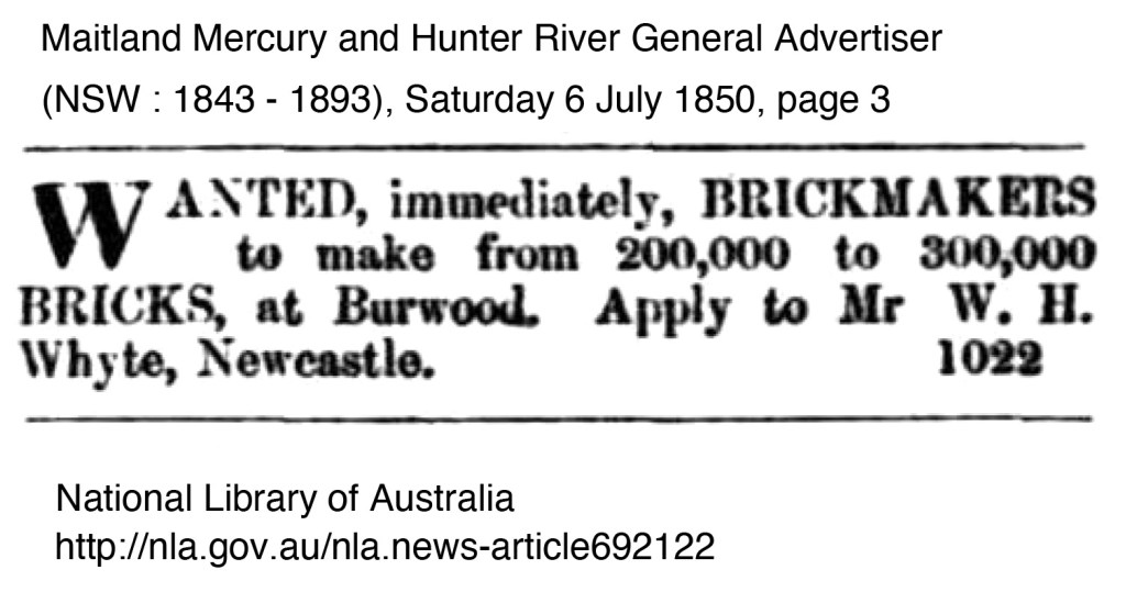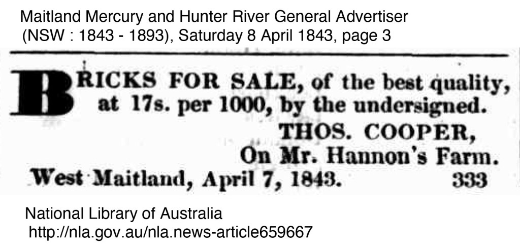 There are however advertisements for local brickmakers and bricks wanted in the local newspapers in 1850 – 1852. Ross Deamer mentions the brickmaker Thomas Cooper,19 he was operating in 1843 in Newcastle but there are insolvency notices in the same year. Some of the advertisements call for a certain number of bricks to be made, below are references from the newspapers.