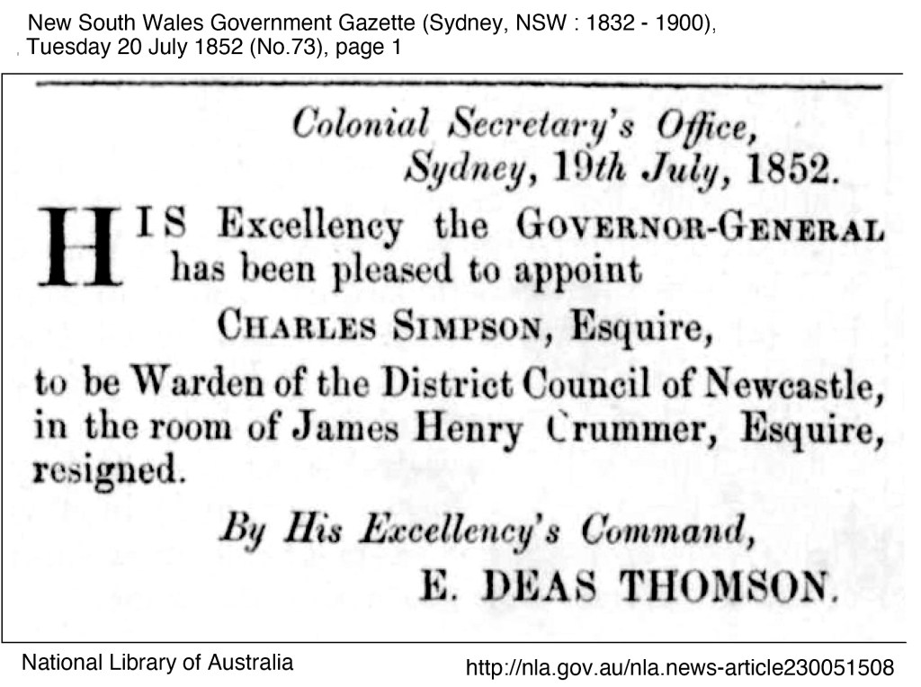 It is not until July 1852 that Charles Simpson takes up his new role in the government public service, this time as the Warden of the District Council of Newcastle.