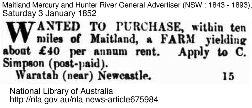 From April 1851 until he advertises for a new farm to purchase in January 1852, Charles Simpson has no references in the local papers.