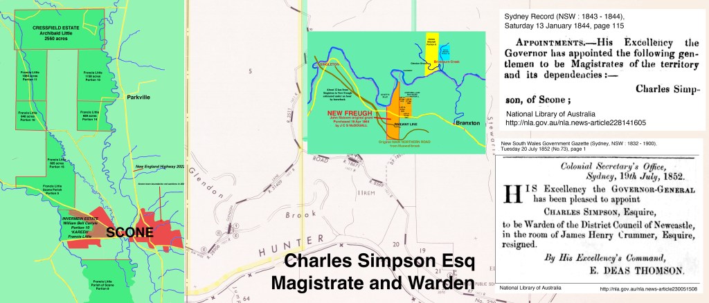 Magistrate and Justice of the Peace Charles Simpson 1845 – 1846 – Patrick’s Plains and Singleton On 16 September 1844, Charles Simpson was appointed a Church Warden at the Scone Parish of the Church of England: ANGLICAN DIOCESE OF NEWCASTLE – SCONE PARISH: [See also A5252 (i)] + GRAY, NANCY: A6083 (i) Agreement to appoint…